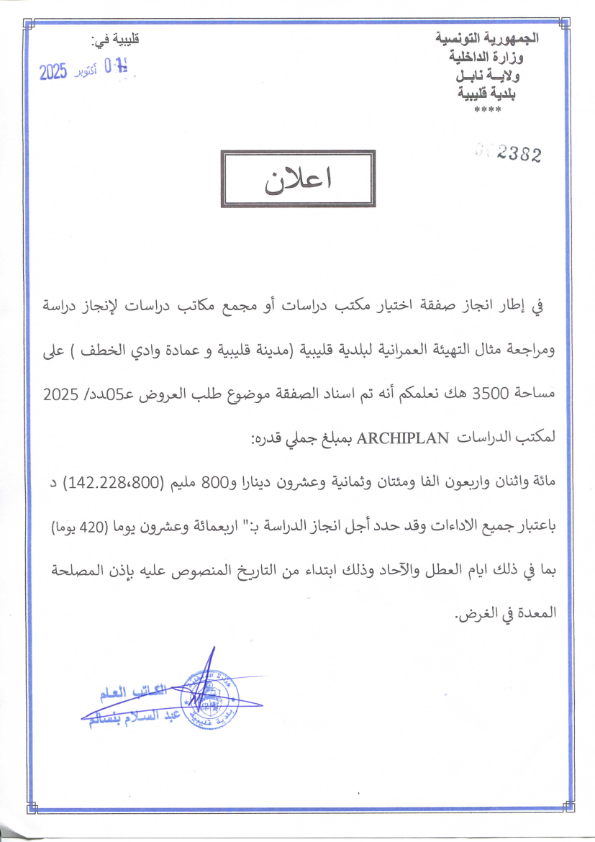 في إطار انجاز صفقة اختيار مكتب دراسات أو مجمع مكاتب دراسات لإنجاز دراسة ومراجعة مثال التهيئة العمرانية لبلدية قليبية (مدينة قليبية و عمادة وادي الخطف ) على مساحة 3500 هك نعلمكم أنه تم اسناد الصفقة موضوع طلب العروض عـ05ـدد/ 2025 لمكتب الدراسات ARCHIPLAN بمبلغ جملي قدره: مائة واثنان واربعون الفا ومئتان وثمانية وعشرون دينارا و800 مليم (142.228،800) د باعتبار جميع الاداءات وقد حدد أجل انجاز الدراسة بـ:" اربعمائة وعشرون يوما (420 يوما) بما في ذلك ايام العطل والآحاد وذلك ابتداء من التاريخ المنصوص عليه بإذن الـمصلحة الـمعدة في الغرض.